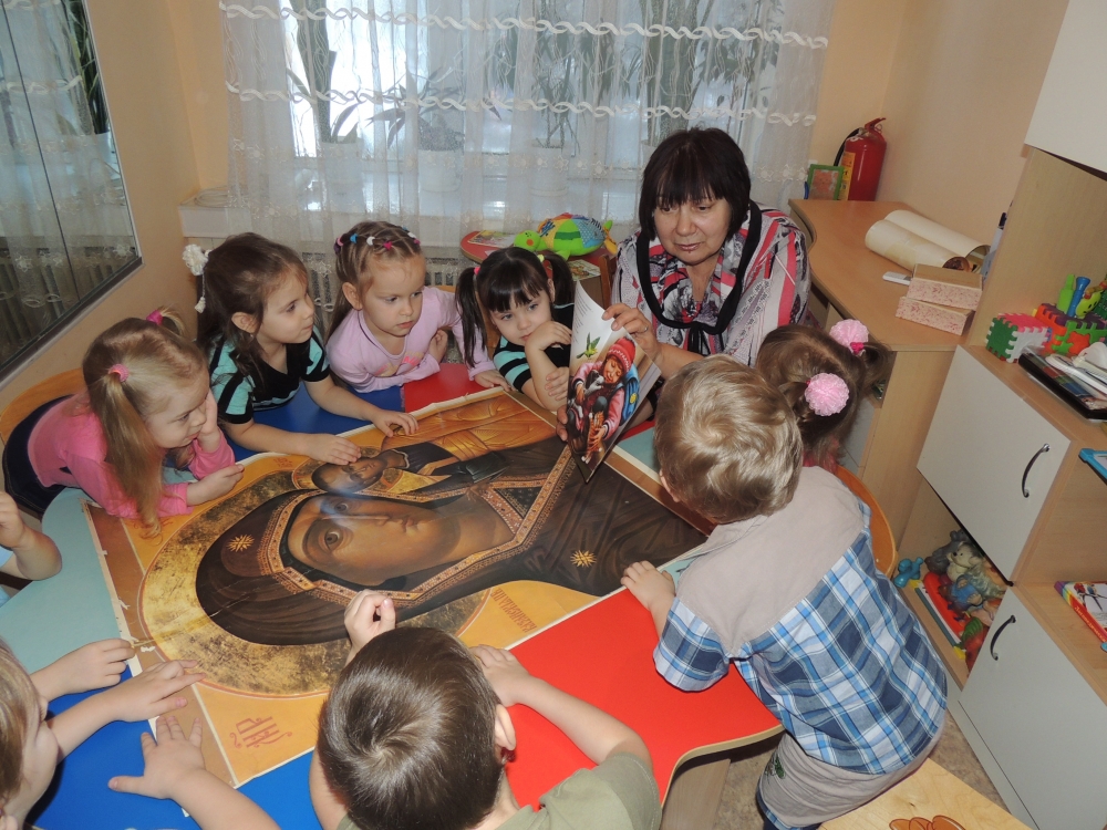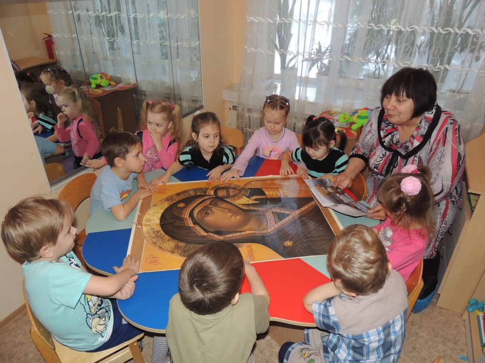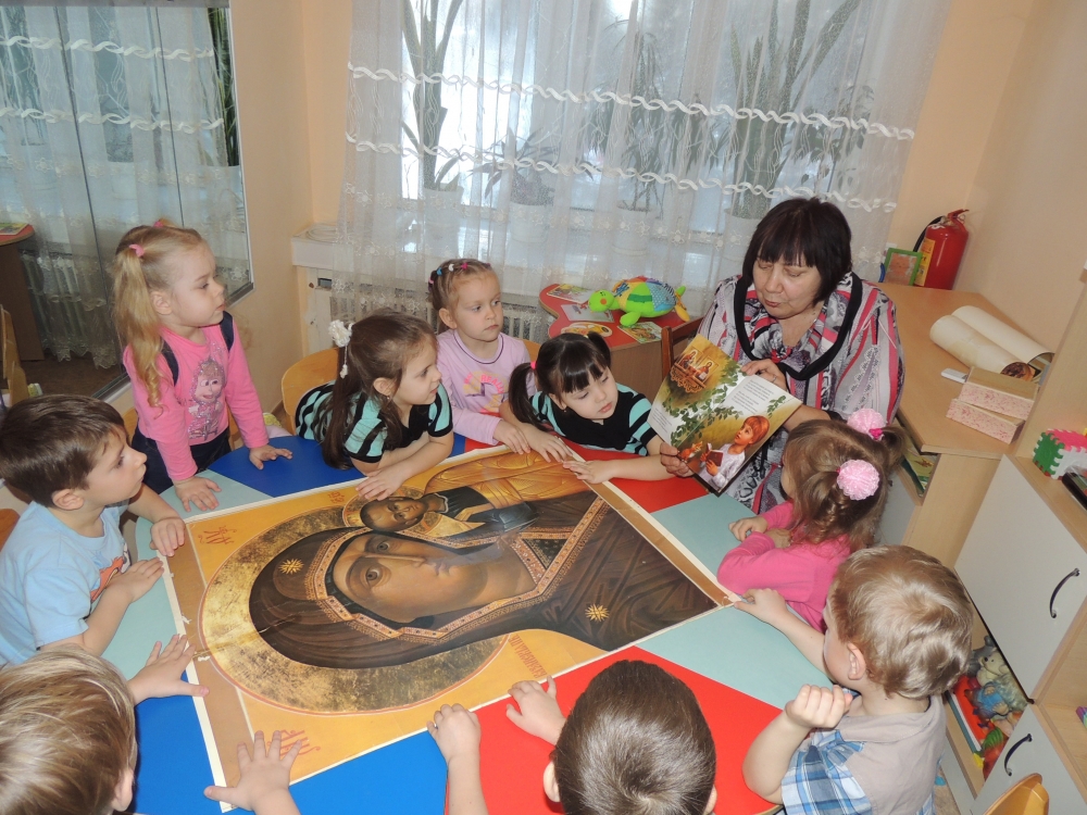 В ходе беседы было показано, что праздник раскрывает нам личность Иисуса Христа как Сына Божия. Также было отмечено, что праздник имеет второе название «Богоявление» потому, что здесь были явлены все Лица Пресвятой Троицы. Далее Лариса Климентова продолжила цикл бесед «Православие в иконе» с детьми старшей группы. Дети познакомились с Казанской иконой Богородицы и иконой праздника «Крещение Господне». Во время беседы дети задали вопрос: «Что это за корона у младенца Христа?» Дети с интересом выслушали объяснение, что такое нимб и почему в нимб Христа вписан крест. Дети оживленно высказывались о том, что такое жалость и сострадание.