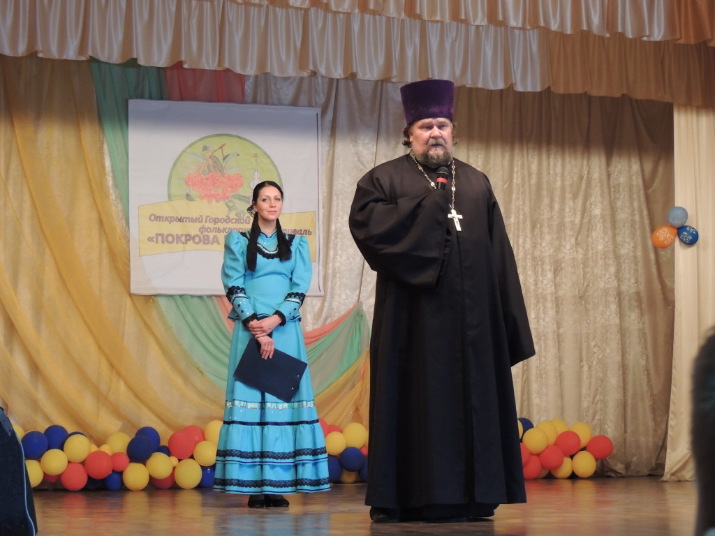 24 октября 2015 г. настоятель Вознесенского прихода г. Батайска иерей Валерий Шильченко по приглашению директора ДК Русь Светланы Банько принял участие в Открытом городском фольклорном фестивале «Покрова на Дону». Организаторами фестиваля являются управление культуры г. Батайска, МБУК Дом культуры «Русь». Торжественное открытие фестиваля началось с приветственного слова начальника управления культуры г. Батайска Антонины Гетьманской. В своём выступлении Антонина Гетьманская отметила, что фольклор является источником познавательного, эстетического, нравственного и творческого развития детей. Радует, что расширяется география участников фестиваля. Так, в фестивале принимают участие коллективы не только из г. Батайска, но и Новочеркасска, Веселовского района, хутора Мещеряковского Верхнедонского района, ст. Казанской Верхнедонского района, коллективы Куйбышевского района, Весёловского района, п. «Дорожный» Сальского района, с.п. Красновское Тарасовского района. Фестиваль способствует сохранению и развитию региональной культуры через приобщение молодёжи к казачьей песне и народному танцу. С пастырским словом к участникам фестиваля обратился иерей Валерий, в котором он поздравил всех участников с праздником Покрова Богородицы, под девизом которого проходит фестиваль. Далее иерей Валерий отметил, что большое значение фестиваля состоит в том, что народное творчество отражает характер русской души, учит жить, верить, творить добро. Казачьи песни говорят о радости, о бедах, о сражении с врагами, о вере и мечтах. При нашем современном темпе жизни нам некогда остановиться, подумать о смысле жизни. В молитве и песне проявляется жизнь души. Иерей Валерий пожелал всем участникам фестиваля творческих успехов. И самое главное, чтобы через народное творчество дети учились сопереживать, любить друг друга, дорожить своими родителями и Родиной.